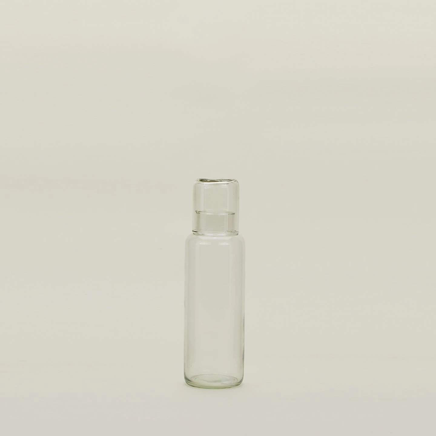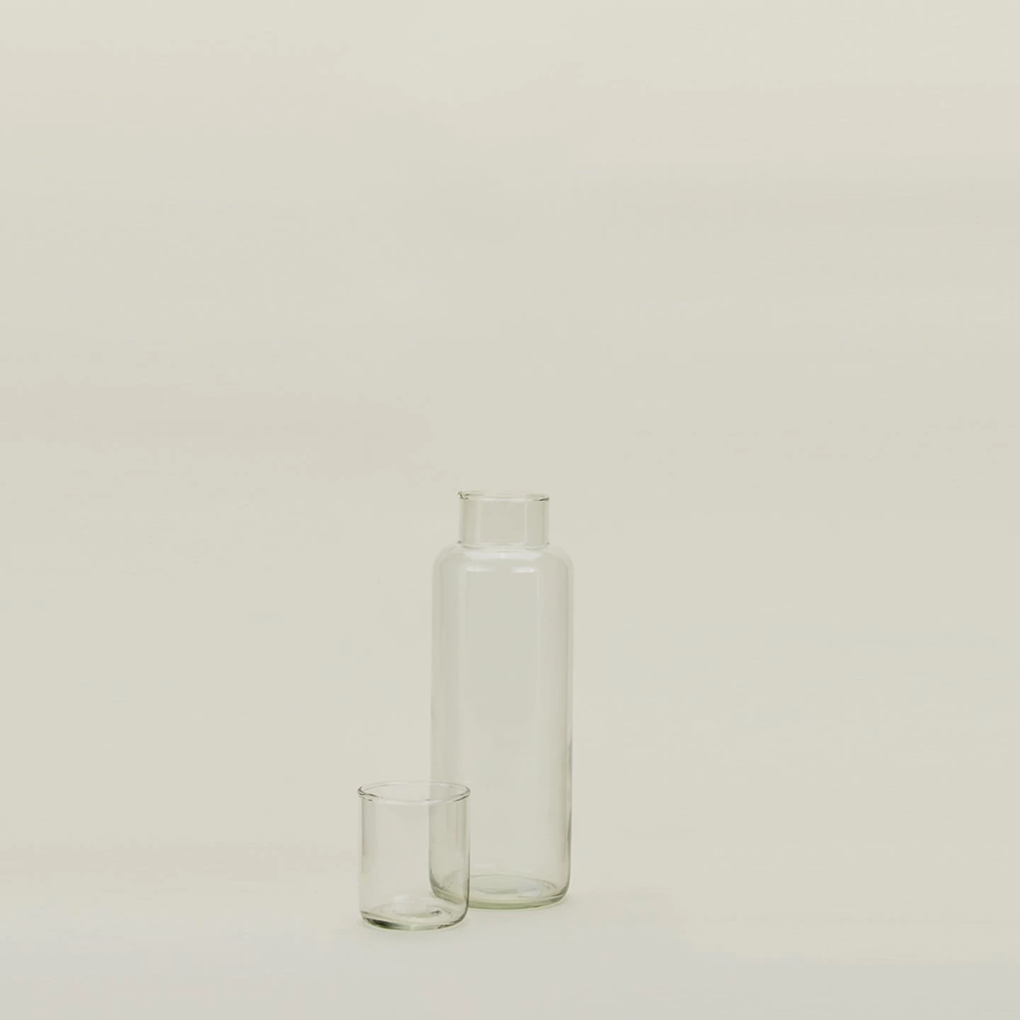 - Unique glass decanter + drinking glass combo made with recycled glass
