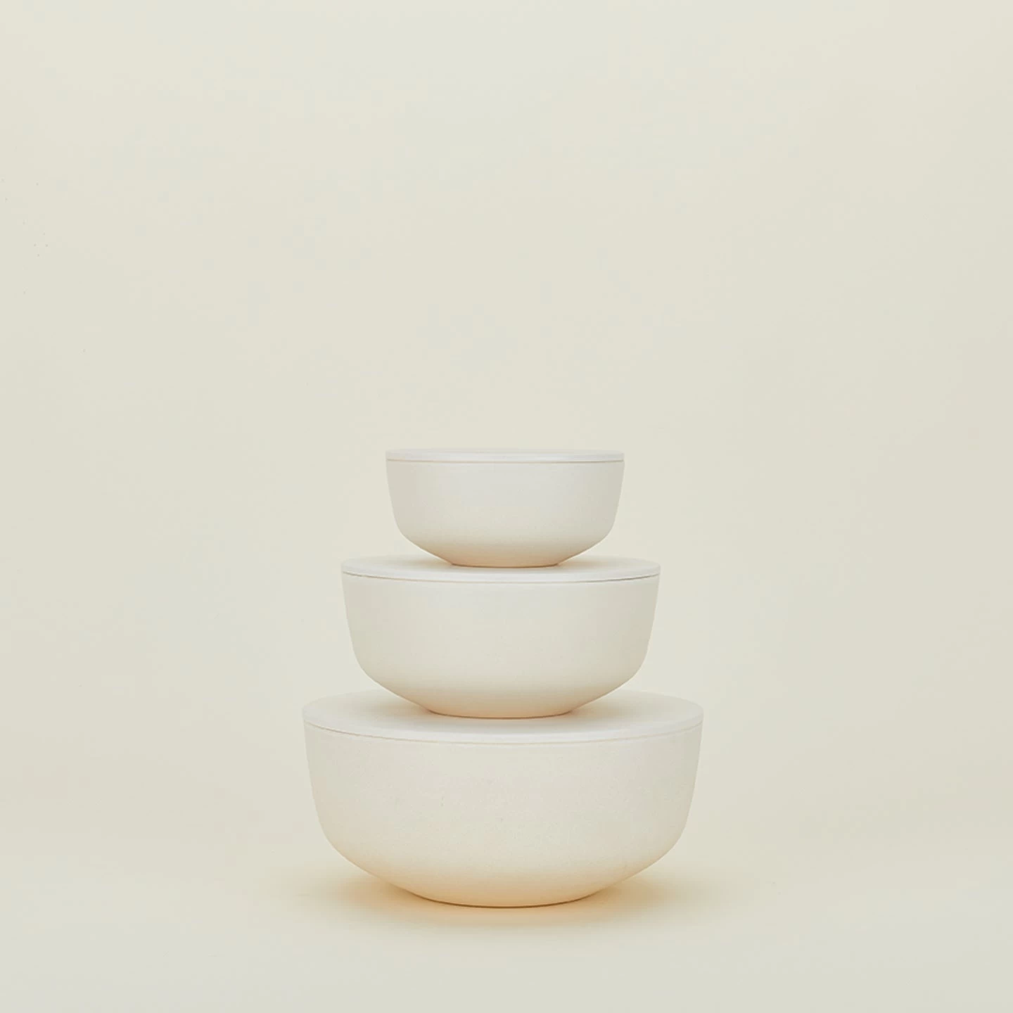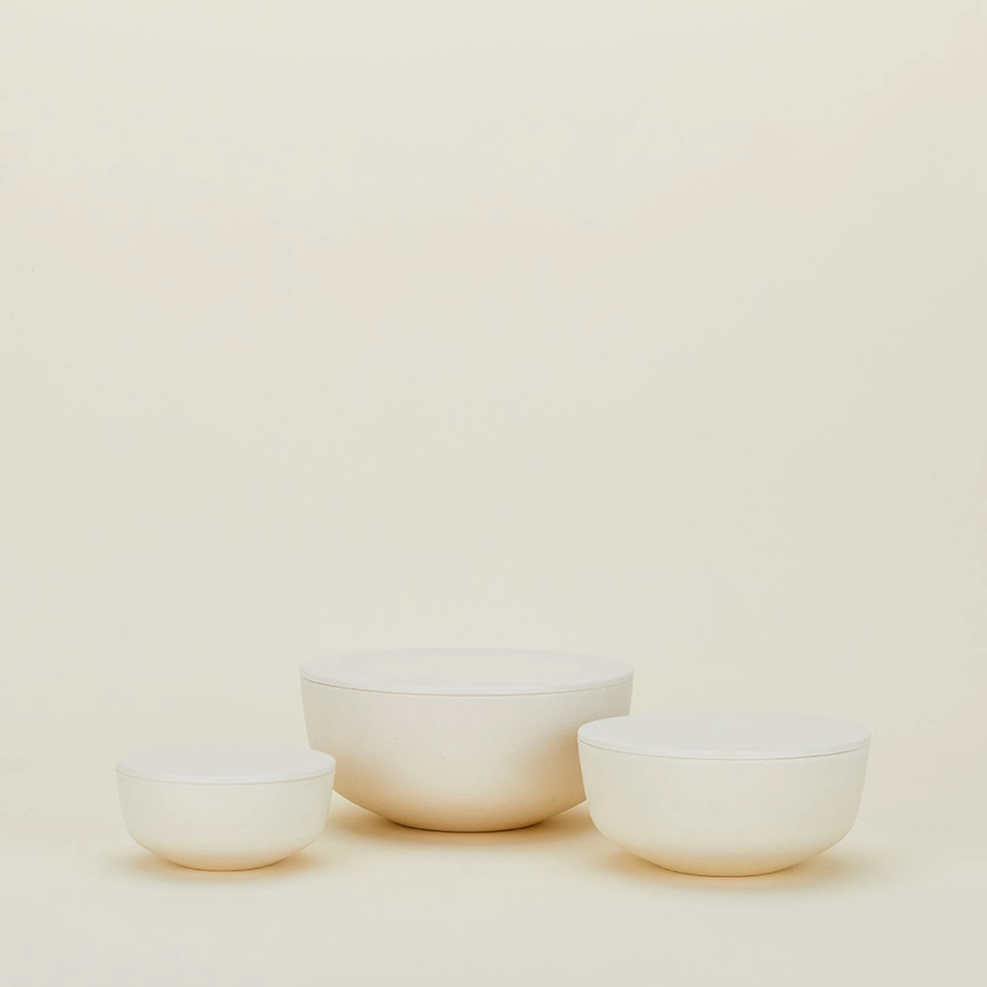 - A set of 3 nestable or stackable lidded bowls in Ivory