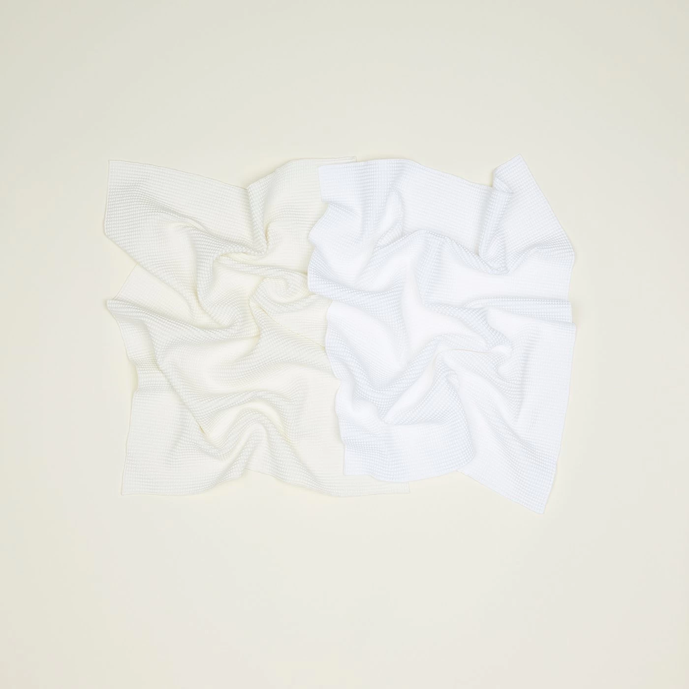- A set of 2 soft waffle weave kitchen towels in complementary shades
