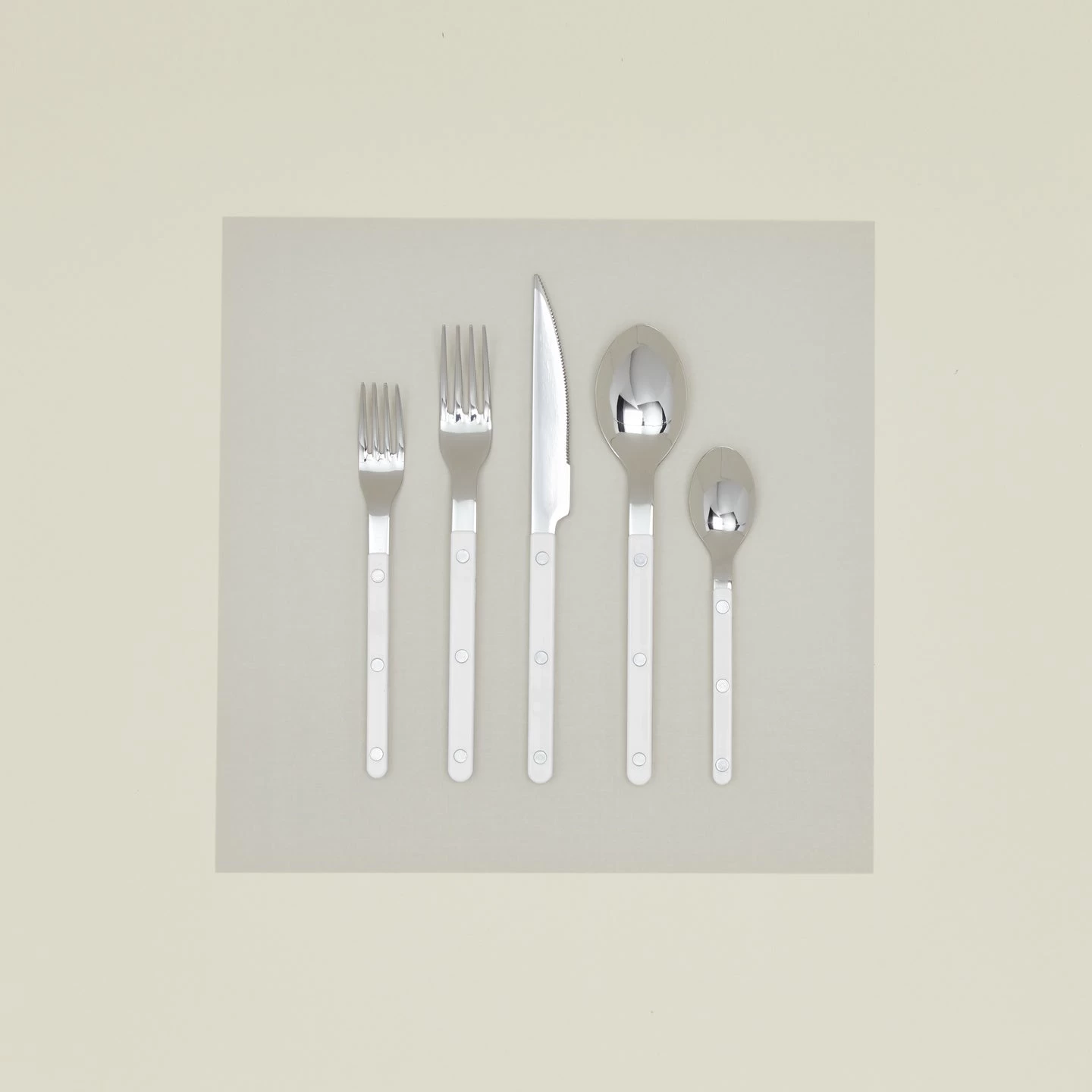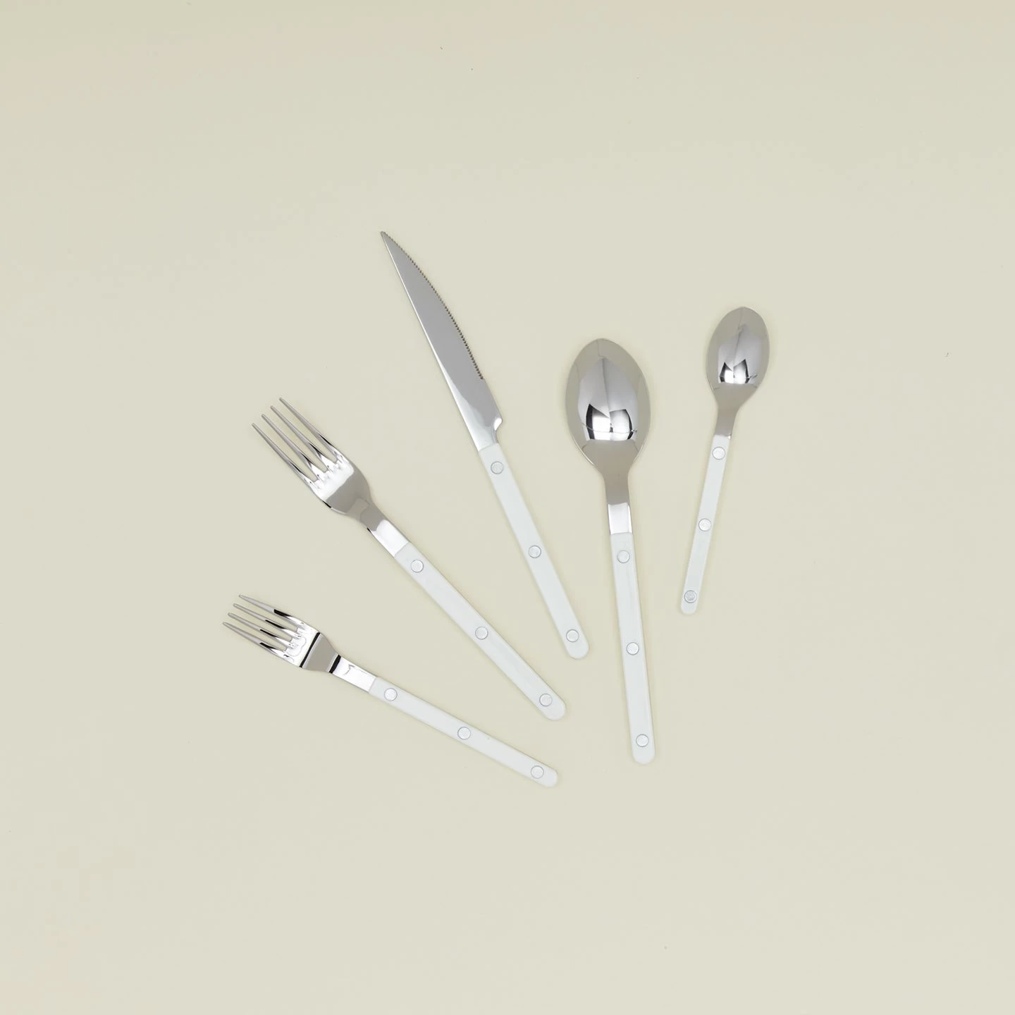 - 5-piece set includes dinner knife, salad + dinner forks, and dinner + dessert spoons